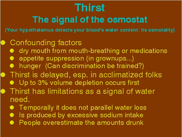 Thirst The signal of the osmostat (Your hypothalamus detects your blood's water content: its osmolality)