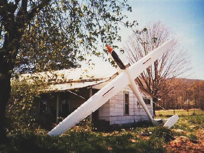 The pilot was attempting a 500K flight; he began a bit too early and after about 40K found himself low and without lift. He positioned himself for an off-field landing, and during his approach was momentarily distracted. His left wingtip snagged the tree, and he dropped to a carrier landing on the roof. When he got out of the cockpit, the CG shift caused the glider to tip off the roof.