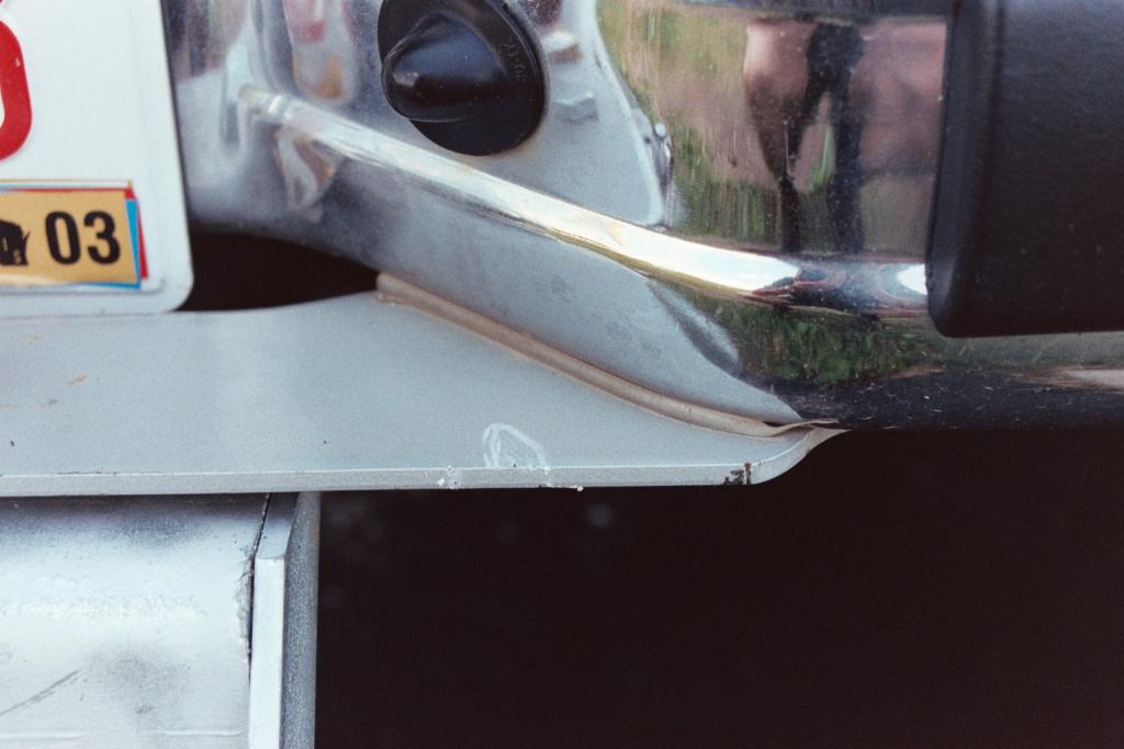 The part of the bumper that the rudder trailing edge struck. I am not sure that the white oval on the top surface was made by the strike; it may have been there before. The tiny white mark on the rear edge to the left of it is new, and was made by the rudder trailing edge.