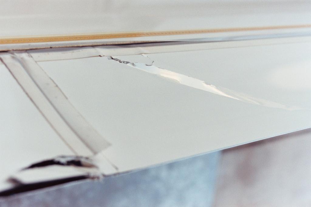 The underside of the inboard end of the middle aileron segment. The carbon fabric can be seen to have a wrinkle that terminates in a tear which extends around to the upper surface. The gap sealing tape is creased, the tape joining the aileron segmetns is torn, a piece of carbon fabric has broken out of the inboard aileron segment. The turbulator strip is intact.