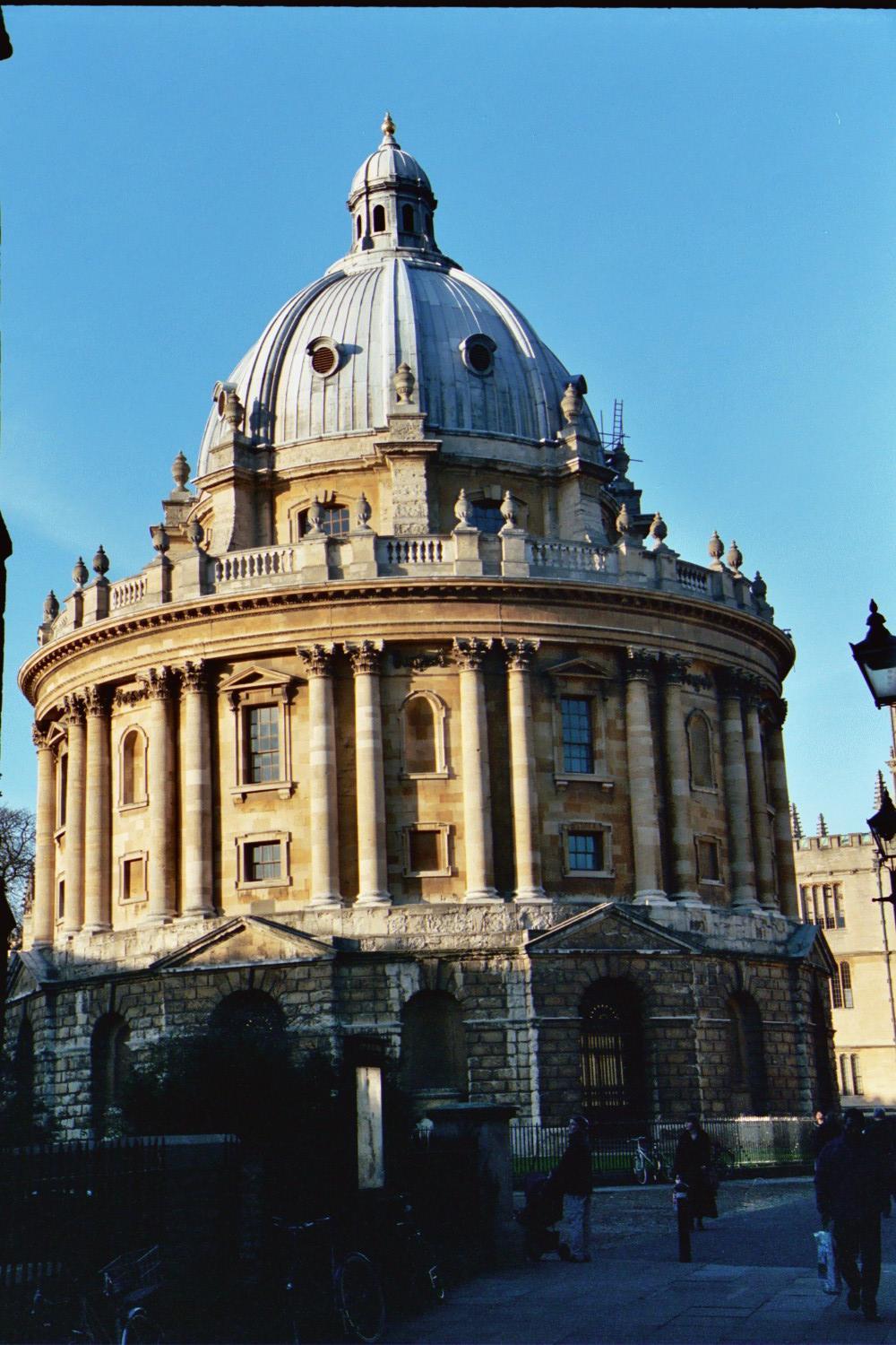 The Radcliffe Camera, S face, late afternoon on a fair winter day. This is a monument to the Medical Ego of John Radcliffe, MD, who left a bag of money and his books and a directive to build this enormous waste of space which has become the International Symbol of Oxford, an ornate and lovable old dinosaur.