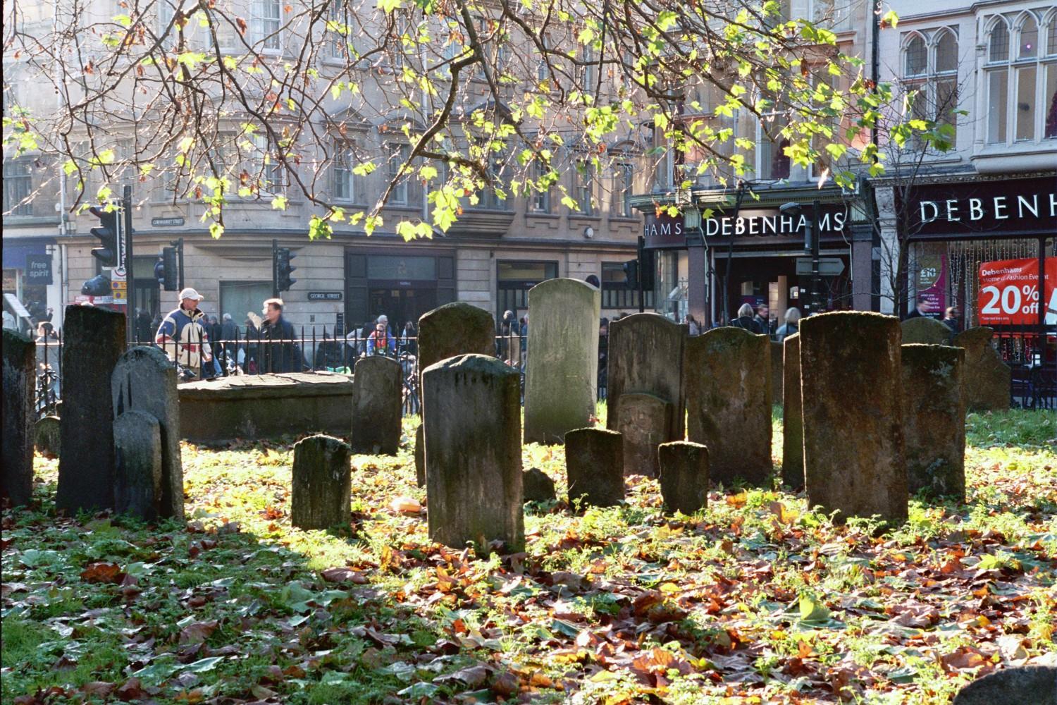 Behind (souith of) the Church of St Mary Magdalen in the centre of Oxford is an old graveyard. Balliol College is behind us, the shops of Magdalen St (Giles St.) in front of us. Shortly after mid-day.