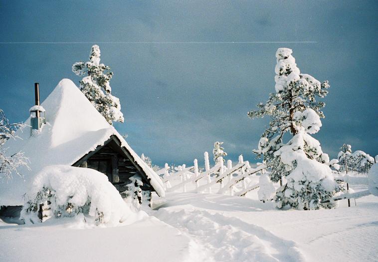 Forground, Veilko's cottage; everywhere, hoar frost.