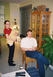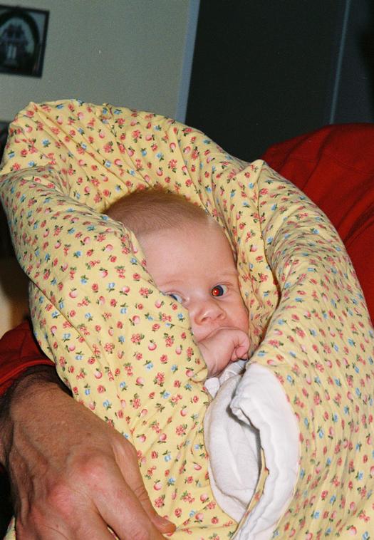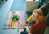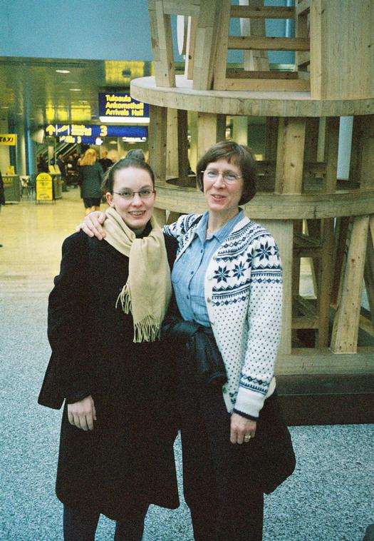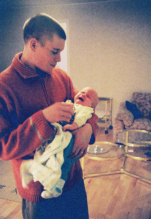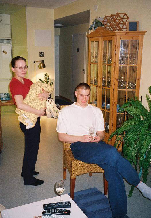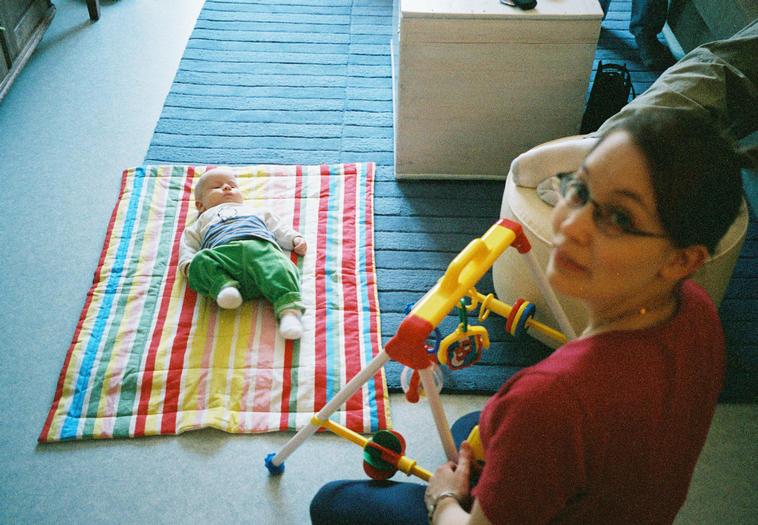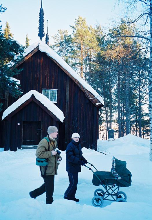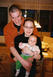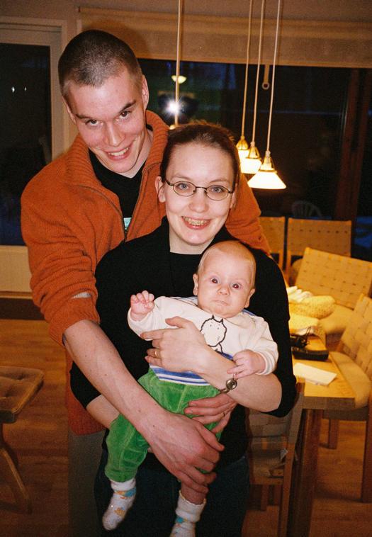 Laura holding Santeri and Mikko Koskinen in attentive dialogue with Isabelle,