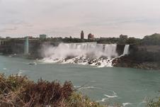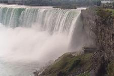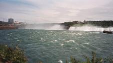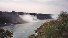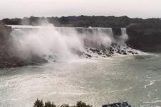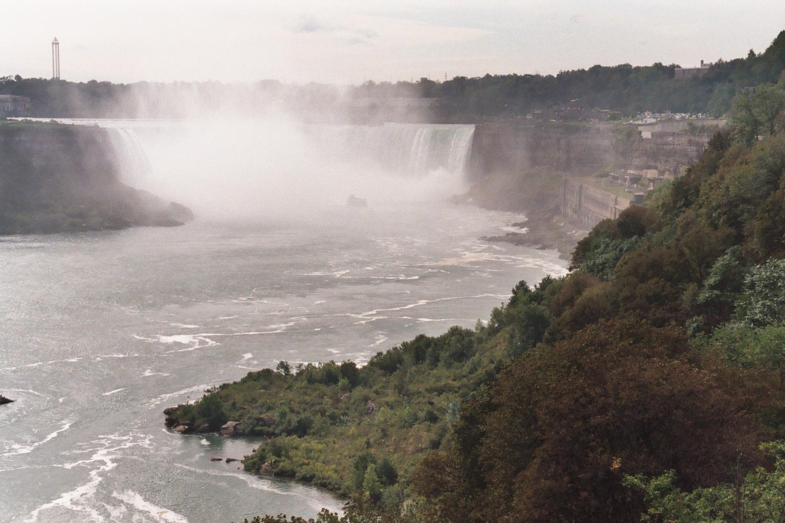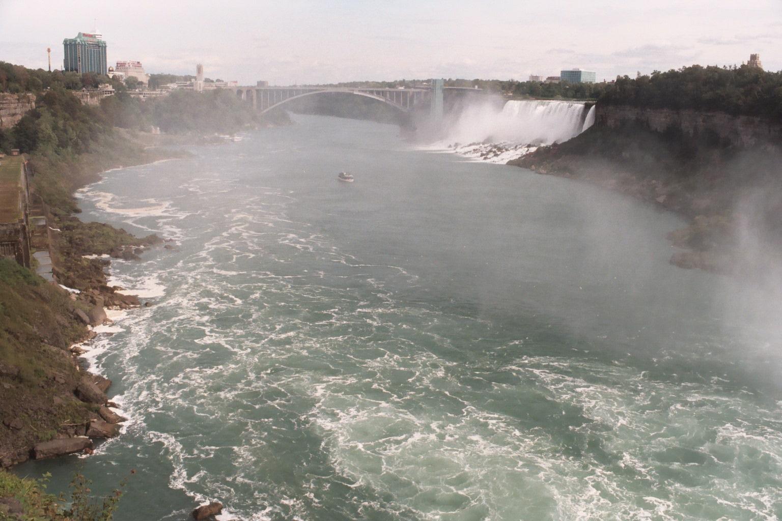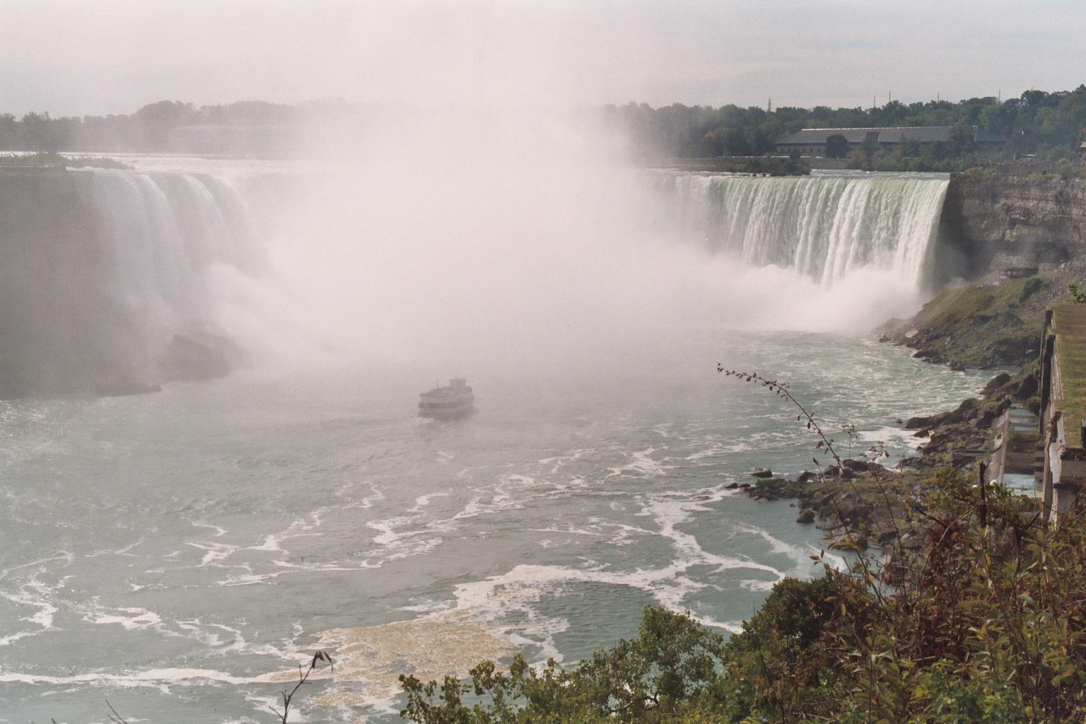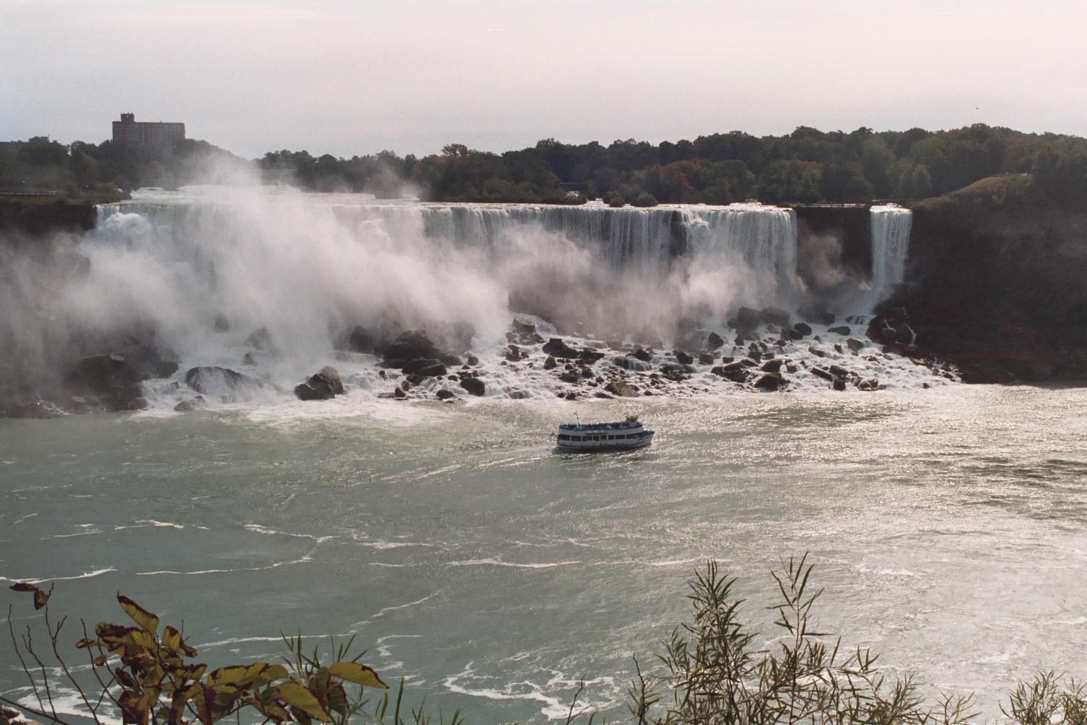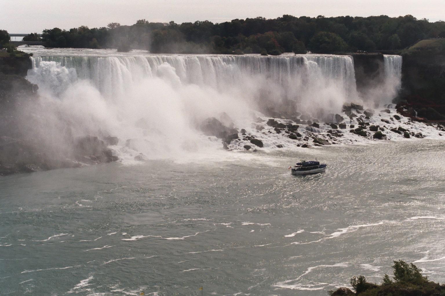 American Niagara Falls, SE from Ontario; with one of the Maids of the Mist, a 3-decker boat, for scale. A SW gale is blowing the spray aside from the falls.