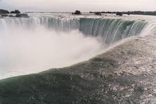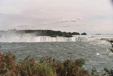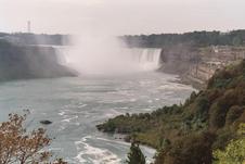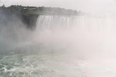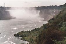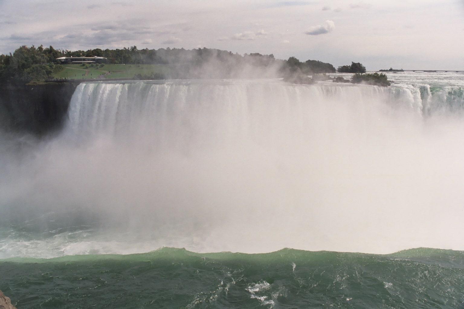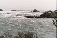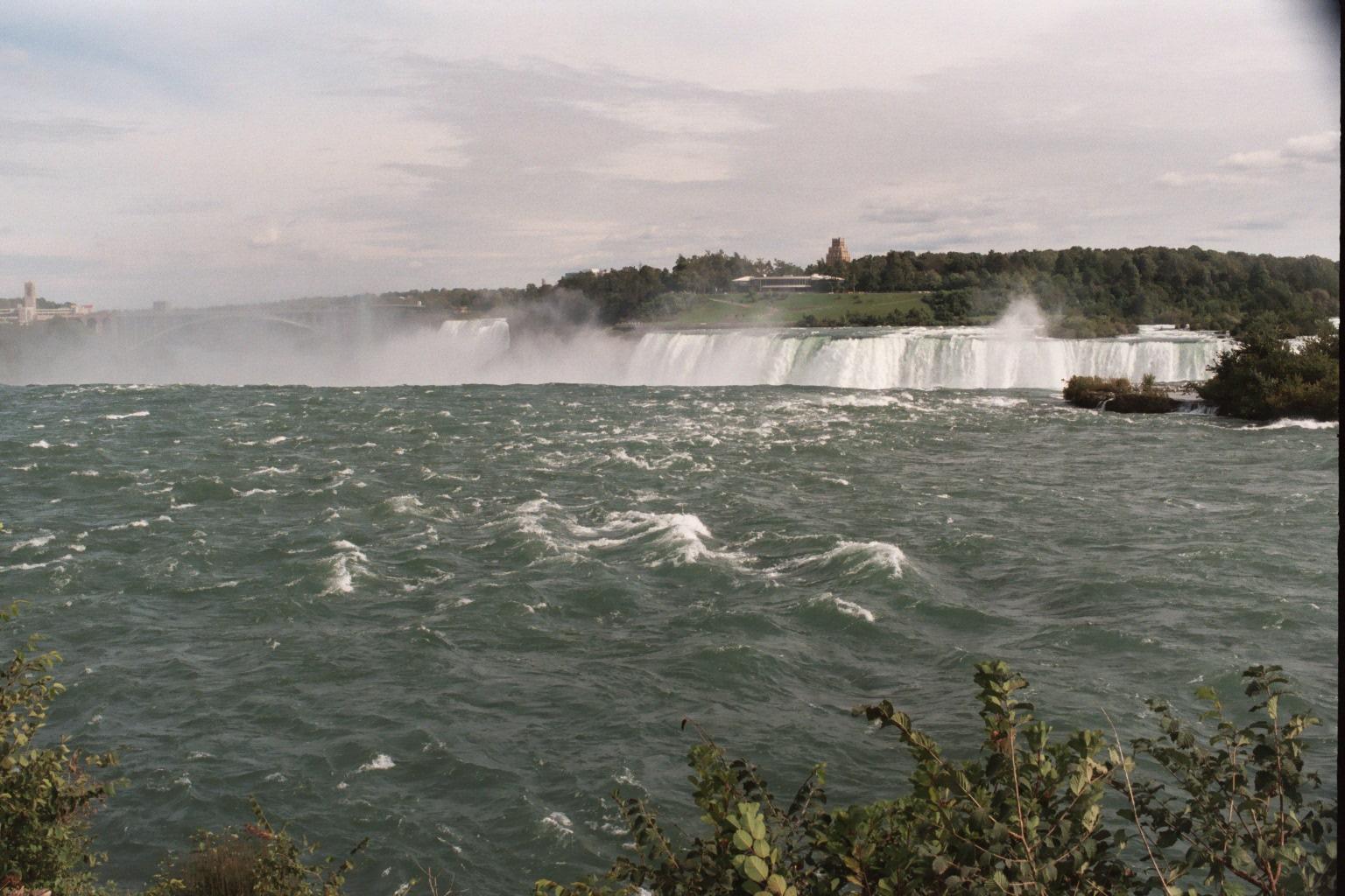 Niagara Falls, Ontario; view downriver to the north. Dufferin Island is beyond Horseshoe Falls; Rainbow Bridge is obscured by mist. This is the way it looks as your boat floats toward the brink...