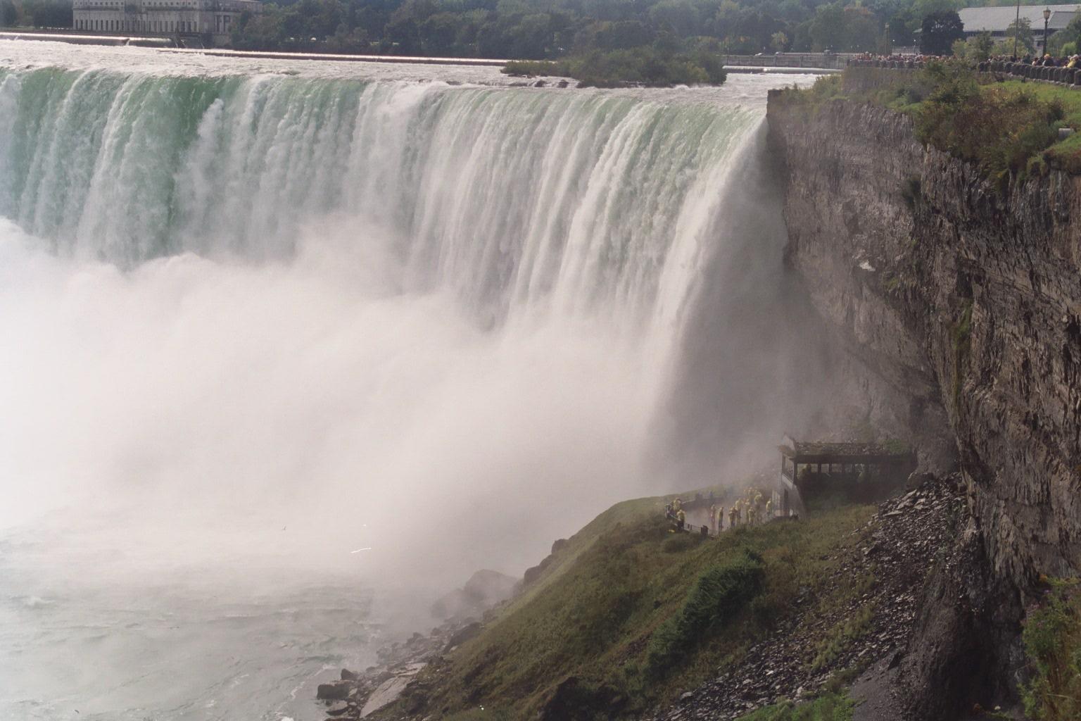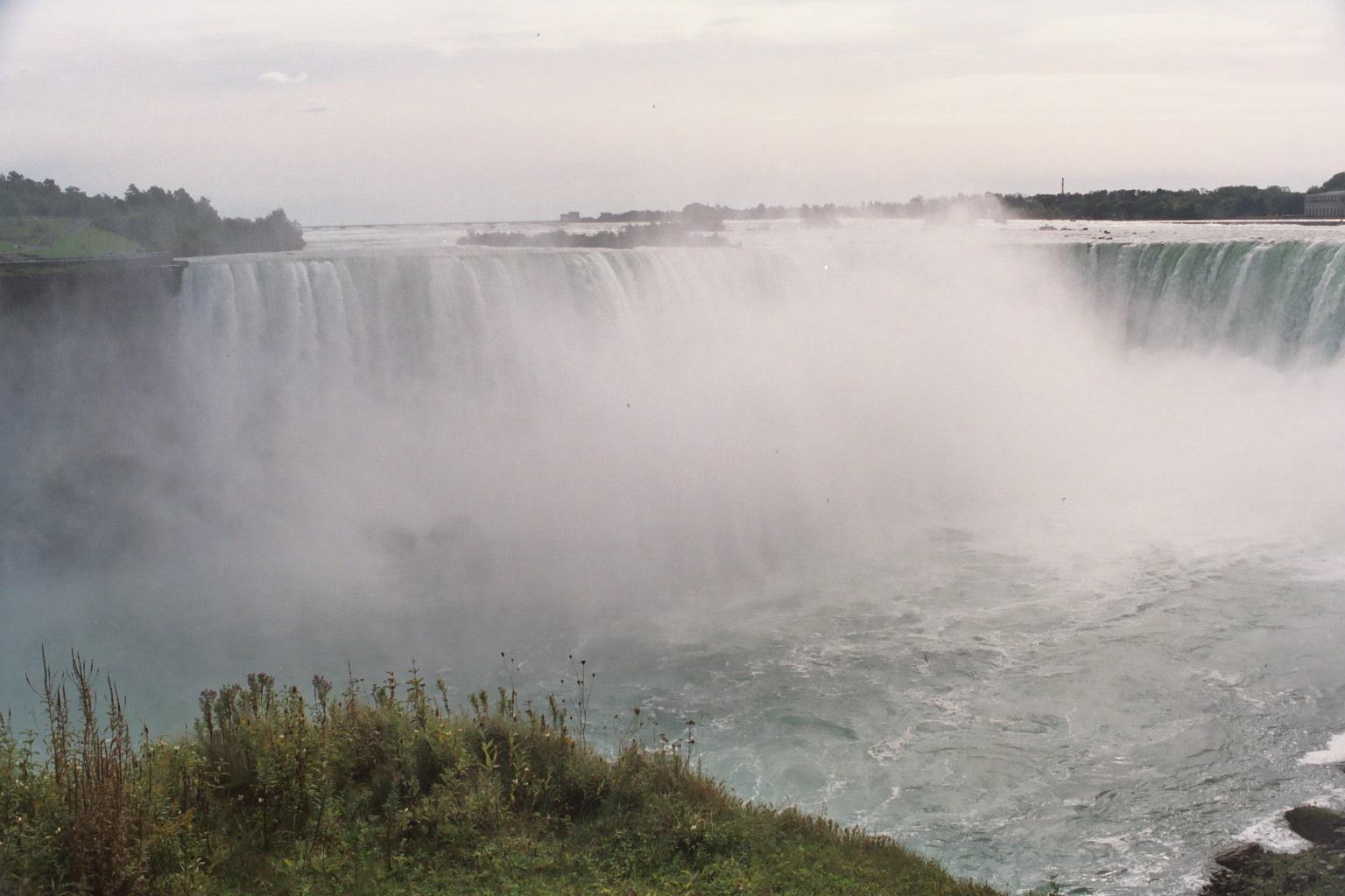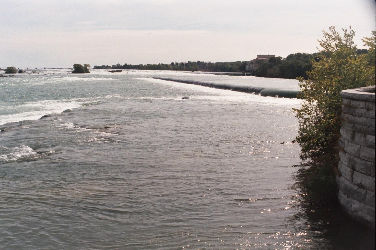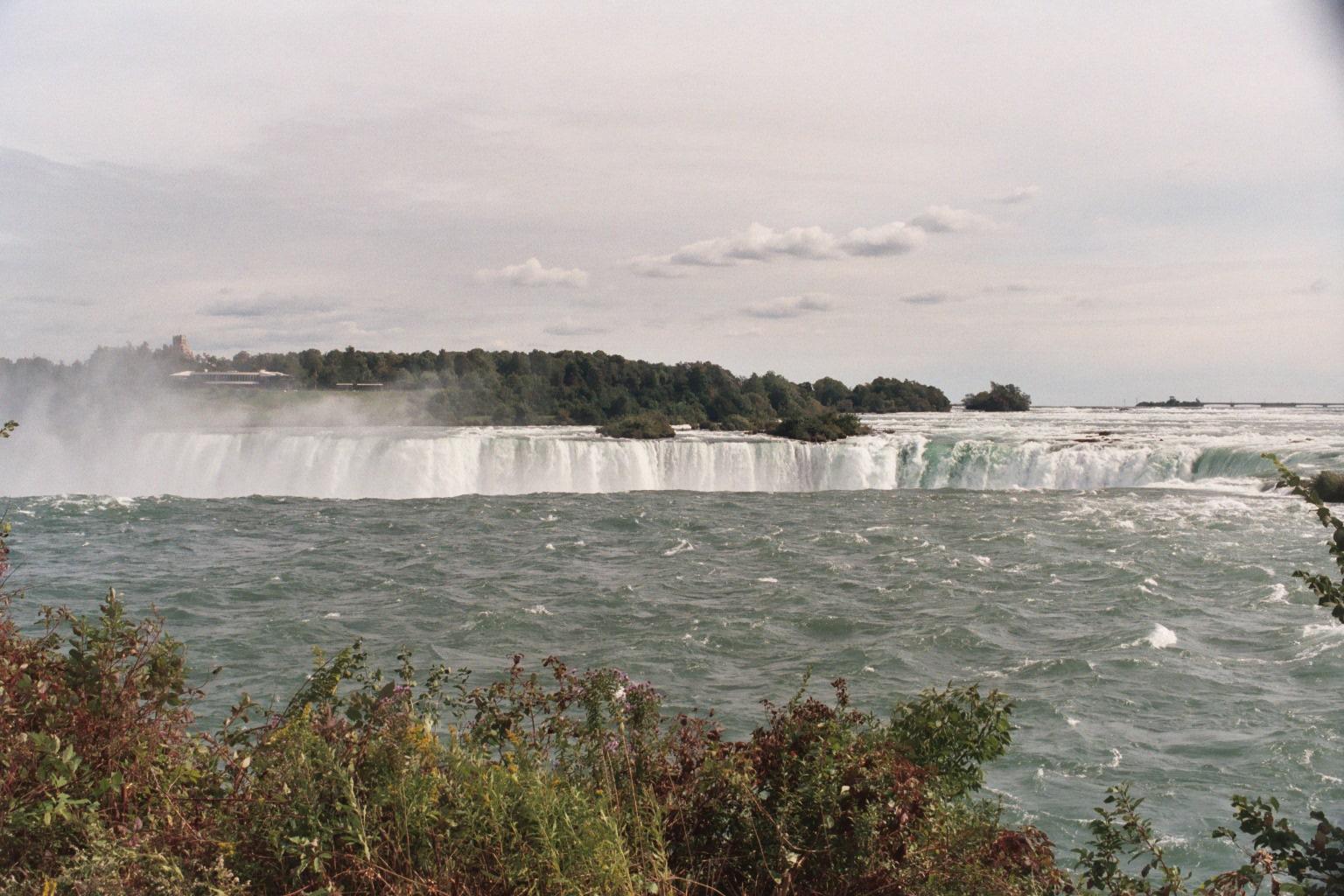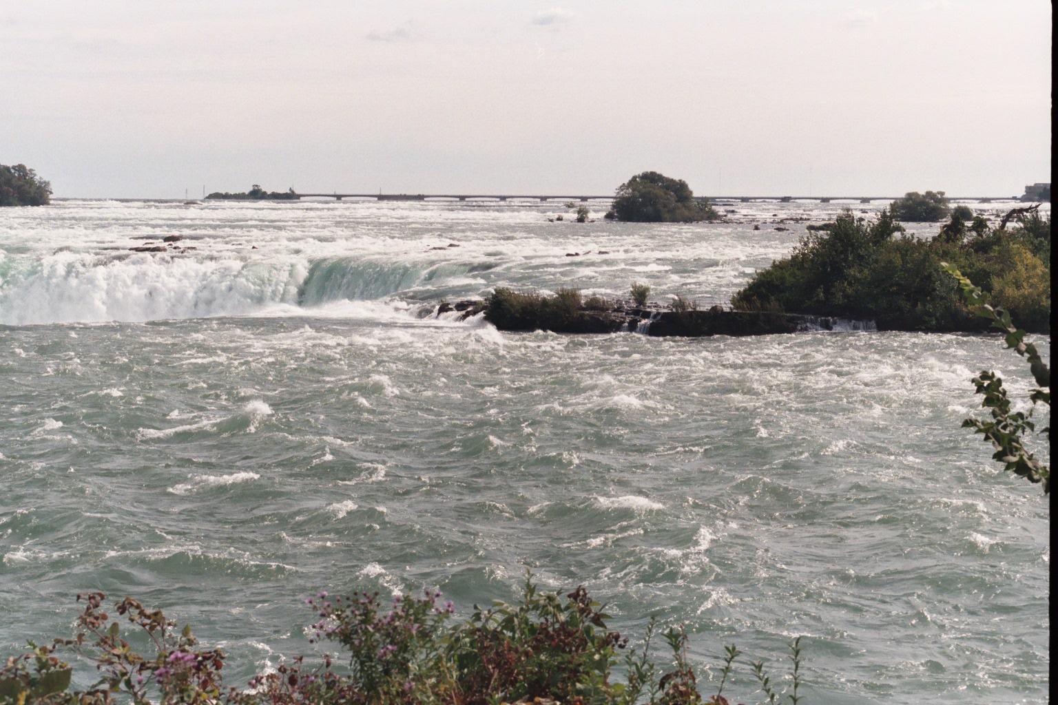 Niagara, Ontario, looking north across the falls. The brink of Horshoe Falls is in the foreground, American Falls is making spume downriver, beyond Dufferin Island.