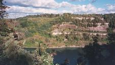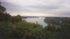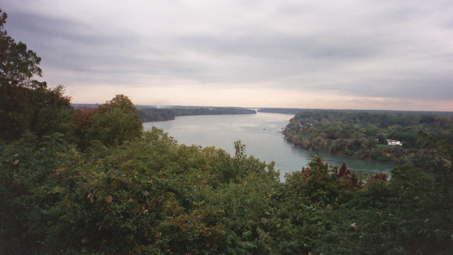 The view north, downstream, along the Niagara River from the verge of the Escarpment down to Lake Ontario.